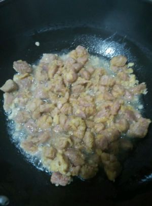 3.把腌制好的肉蘸干淀粉过油炸,炸两遍这样吃起来酥脆。