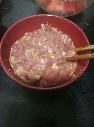 1.肉切稍厚一点的片,然后放葱姜,盐,料酒,鸡蛋腌制半小时。