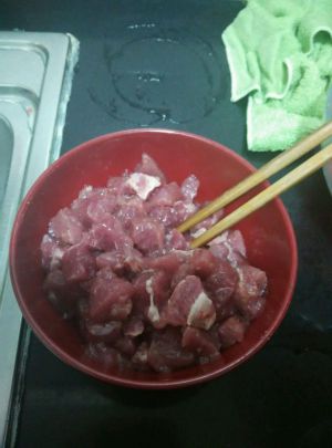 肉切小块,用盐,胡椒粉,花椒粉,腌制一下。本来还应该用点料酒,但是家里没有了,所以我没有用。