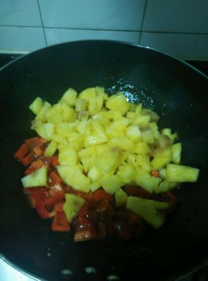 热锅中,放入少许油,倒入红椒炒香,倒入菠萝翻炒至出汁;