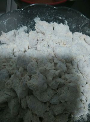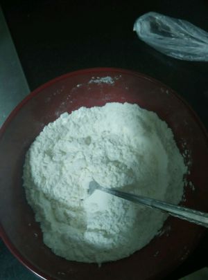 面粉+糯米粉 (其实也可以不用糯米粉,我见着正好家里有就加了两勺) ,倒入沾满蛋液的肉,裹匀。
