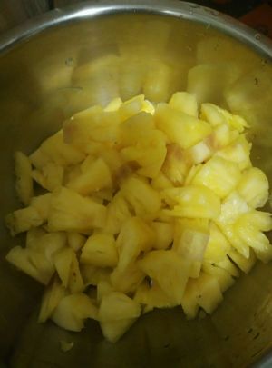 2.把菠萝切块。再把番茄酱,糖,1:1:1调匀。