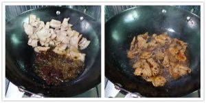 煸炒至看不见水汽、油色清亮时,将肉片推至一边,加入郫县豆瓣炒香炒红