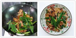 加入蒜苗炒至断生后起锅装盘