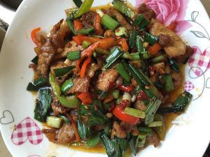 起锅热油,放入切好的肉,大火炸出油,翻炒至八成熟,转中火,放入蒜苗,红椒,翻炒8分钟,放入鸡精调味,再放入一点点豆瓣酱,翻炒