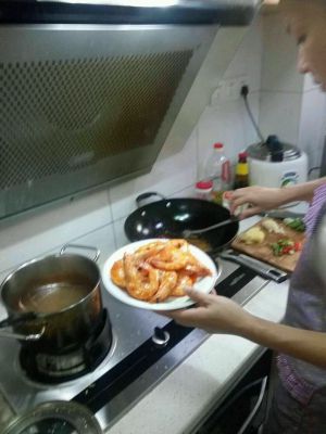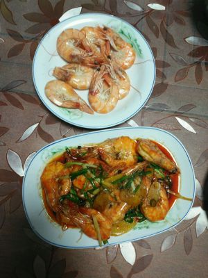 煎炸好后捞出虾,剩余的油继续留着煸炒姜蒜辣椒,新鲜的虾会出红油,不需要再添加酱油,蚝油我爱吃,可以不放!