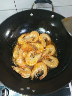 起锅热油,比平时炒菜略多点油,直接把虾放入,翻炒,虾炸至金黄色。