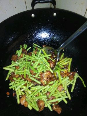 淋入适量酱油铲匀,把豇豆倒进去