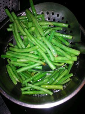 锅里烧开少量开水,豇豆下锅烫一下捞起,豇豆上微微撒点盐