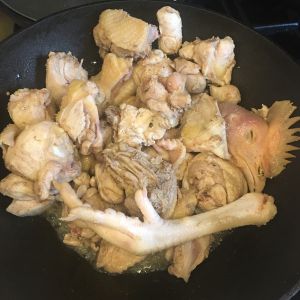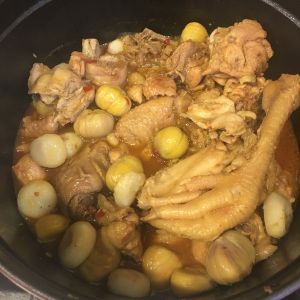 沿锅边淋入一大勺黄酒和一大勺生抽。加入水末过鸡块煮20分钟左右再加入熟板栗煮15分钟。