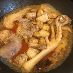 放入水、生抽、白糖和八角盖锅盖焖至鸡肉六七成烂(最好换到铸铁锅里焖,更香)