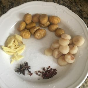准备食材:手枪腿,板栗 准备配料:生姜,大葱,大蒜,盐,糖,生抽,老抽,啤酒