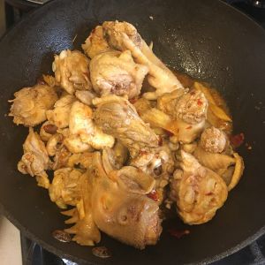 下鸡肉上糖色。加生抽、料酒,翻炒均匀。