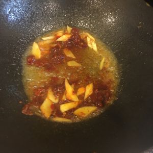 锅里留油放入姜片爆香,放豆瓣酱炒成红油