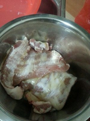 准备材料。将猪肉洗净,放入清水中浸泡2小时,浸泡出血水后,捞出沥干,控干水分,切成拳头大小的块。