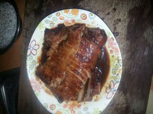 烤盘内铺一层锡纸,将腌好的肉置于烤网上,并刷上一些腌渍时使用的酱料。放入预热好的烤箱中下层,以200度的温度,烤制30分钟。30分钟后,将肉取出,翻面,再将剩余的酱料均匀地刷在肉上,继续烤30分钟。