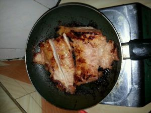 不粘锅放少许油加热、放入淹好的猪颈肉慢火煎、两面各煎八分钟基本就熟了!如果肉较厚应多煎一下!