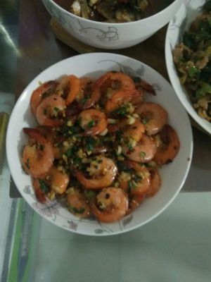放虾炸黄,放凋味品,少量水,收汁,放葱起锅。