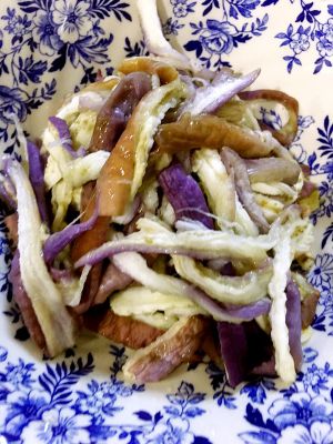 上锅蒸熟,大概十分钟到十五分钟即可,熟后自然凉凉,最好能放在带孔的器具中,放凉的过程顺便让茄子的水分流失一部分。