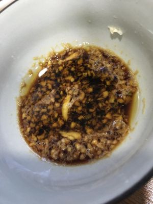 调酱汁。生抽,醋,少许糖,蒜泥,芝麻油多一点。加香菜也很好吃。