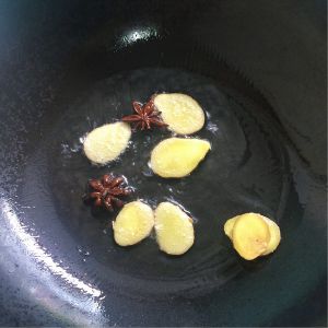 锅子烧热后放油,油温五成热时放入八角与姜片爆香。