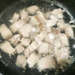锅内放半锅冷水,肉一同冷水下锅,水开后大火煮两分钟,捞出用温水冲洗干净,沥干水分。