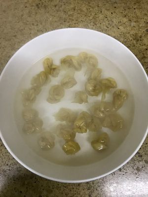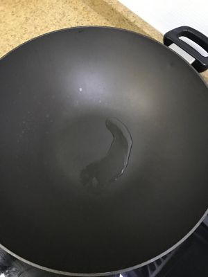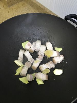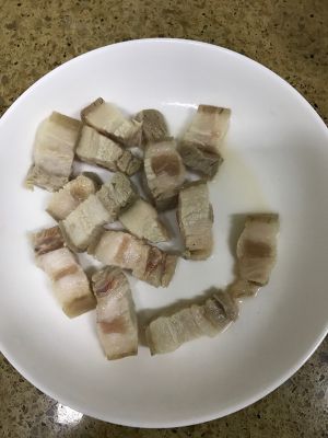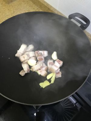 空锅烧至冒烟,把五花肉皮那一面放上面烙一会儿,拿起来,用刀刮一刮焦的部分,洗干净。