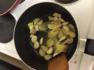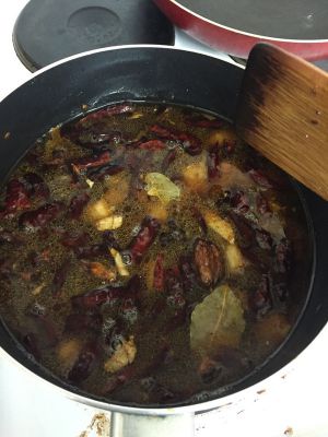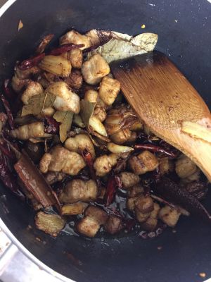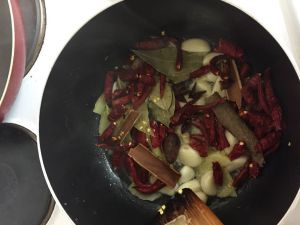 放入备好的香料煸炒出香味,因为是用的宿舍的那种炉子,火力比较小没那么容易糊。大家可以适当把火调小的,免得香料糊掉