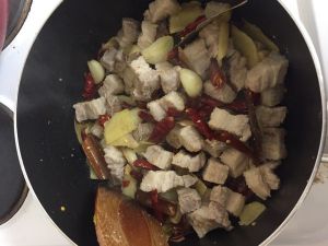 放入焯好肉块,煸炒。炒至肉微微变得焦黄。如果肥肉多的话也可以多把油炒出来~