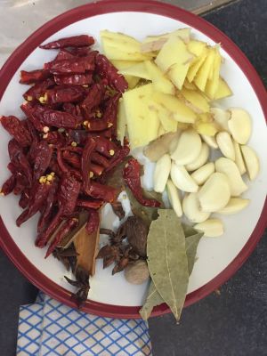 姜切片。大蒜剥好,因为有的大蒜瓣会比较大,我会改刀改小,自己可以看自己喜好,蒜瓣小的话最后都会融掉。干辣椒,草果,豆蔻,桂皮,香叶,八角洗净备好。