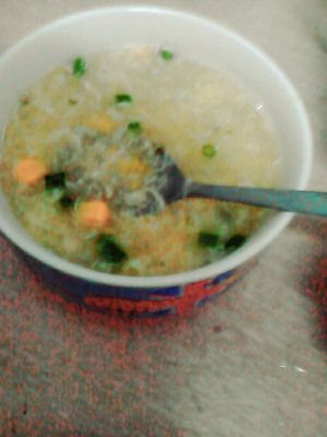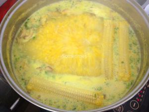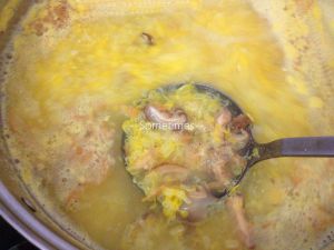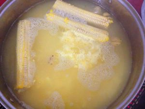 玉米粒煮开了以后,就加虾皮和干冬菇片,继续煮。