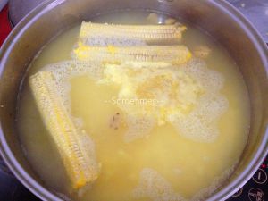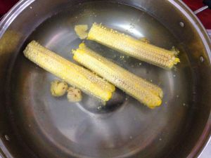 锅里放水,把擦完的玉米棒放进去,再放一点姜片,驱寒。
