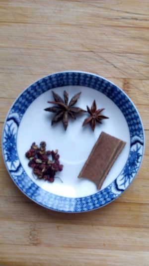 3、准备调料。3汤匙味极鲜、2汤匙老抽、2汤匙蚝油、一块腐乳、一小勺黄豆酱、几片山楂片(促进肉软烂)、一块桂皮、两个八角、两片生姜、四段大葱、两片香叶、20粒左右茴香籽。