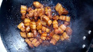 4、炒糖色。小火,锅底放油、冰糖,不停搅拌,炒至红棕色,倒入五花肉块,迅速翻炒上色。