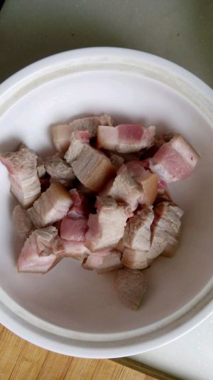 五花肉洗净切大几大块在锅里煮熟,这时可以把其他料洗净备用,肉煮熟捞起切小块备用。