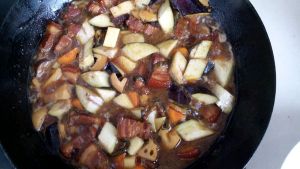 加入茄子 土豆 胡萝卜。小火炖到各种菜熟了,换大火收汤,就ok了。