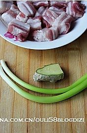水中倒入小半杯的料酒去腥葱切段姜切片备用