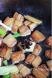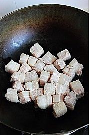 炒出糖色后放入用水焯过的肉,炒之前我是用水焯过的肉,焯水的时候放点料酒去腥