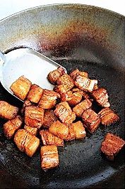倒入盘中的五花肉,翻炒均匀,使其均沾上糖色。