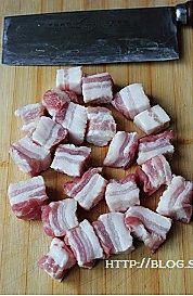 切的形状大小很重要,大概5cm*5cm左右的方块大小,连皮带肥瘦整一块,吃的时候才会满口充斥三个部位的交融