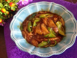 在倒入炸好的茄子,一起炒下,最后家蒜茸、盐、糖、醋,调味出锅。