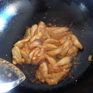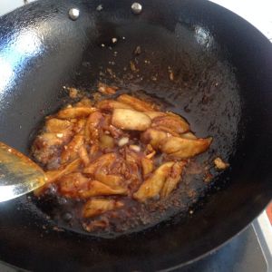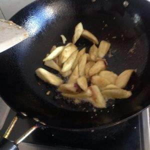 煸炒一下,把炸好去过油的鸡蛋茄子倒入锅中翻炒