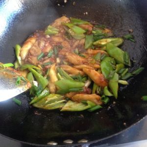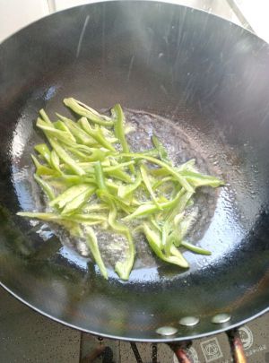 锅中剩下的底油,倒入切好的青椒丝,加少许盐,炒下。