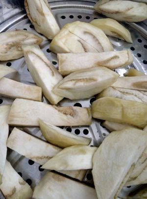 茄子去皮,切成如图稍大点一条一条的,上锅蒸10分钟。
