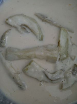 炸茄子:锅里的油热了后,将茄子在鸡蛋里一片一片的翻滚一下,保证每片茄子都裹上鸡蛋液,然后下锅炸
