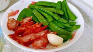 锅烧热放油,煸香蒜片再放入腊肠和荷兰豆,然后放少许白糖炒同炒;