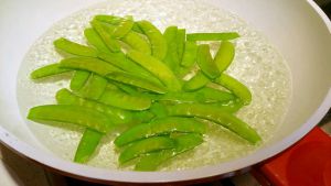 荷兰豆洗净,剪掉两段筋蒂,开水加少许盐,焯2-3分钟。