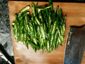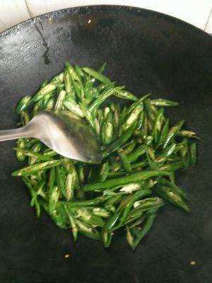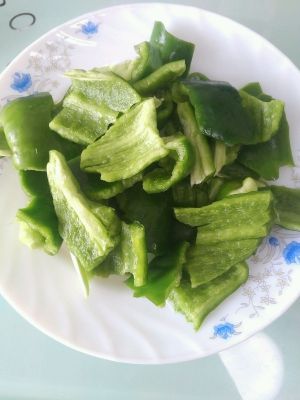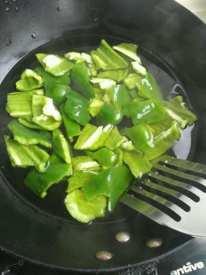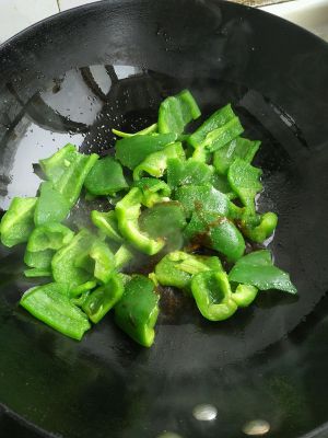 先将切好的青椒放进锅里翻炒,待炒出香味