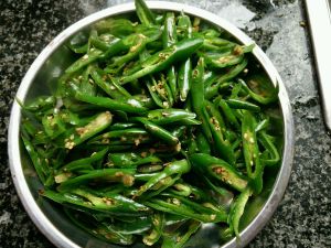 水里加入少许盐,可使青椒保留原有味道,颜色鲜亮~水开放入,一分钟左右捞出控水