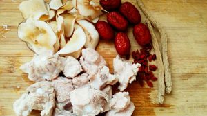 把切好的排骨用冷水泡10分钟,开水把排骨沸水,用冷水冲,准备好海底椰,红枣,枸杞,沙参备用